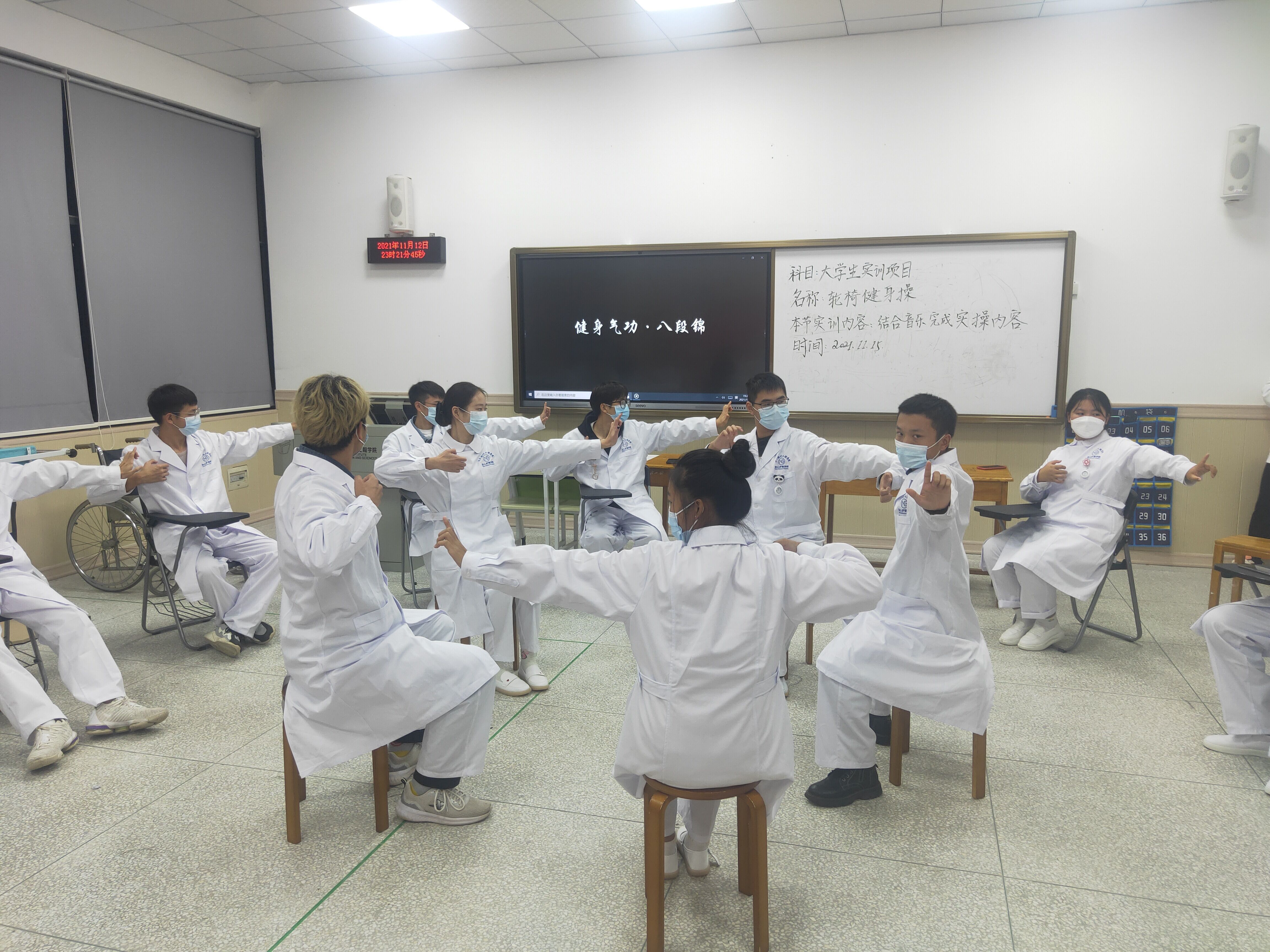 这段轮椅健身操八段锦,同学们都非常认真的学习,此次考试由康复治疗技术专业李宋倩老师带领大家,同学们都穿戴整齐,聚精会神的训练。